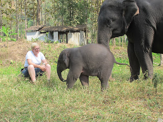 We learnt further manual handling techniques too in order to request our elephants to move left and right. The command given is the same for both - "kwey", however the accompanying movement varies. Similar to riding a horse, you use pressure from you right leg, and kicking with your left, to turn right, while saying "kwey". Then to turn left you do the reverse, that is, apply pressure with your left leg, and kick with your right. Simple really. Until you realise that this huge animal is under your control and you don't really have any idea what you are doing. Luckily our mahouts were walking alongside, so I was quietly encouraged when mine started singing. It made me thing that maybe I was doing ok enough that he could sing and not keep correcting what I was telling the elephant. Mahouts earn about 4500 Baht a month, plus receive free accommodation and one bag of rice a month. That's less than $150 a month. Based on the accommodation for paying guests, I am guessing a shack in the forest might be all it amounts to. Seems to me they work for the love of it, not the big bucks.